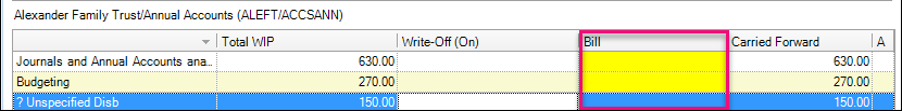 If you enter an amount in the Bill field other than the full WIP amount, the remaining unallocated WIP will be carried forward to be allocated to the next bill.
