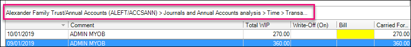 The text above the WIP items tells you where you are when drilling into the information. For example, if you group by client, assignment/job and employee, then drill into one of the employees to view the individual transactions.