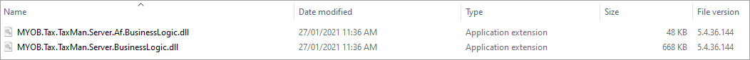 MYOB.Tax.TaxMan.Server.BusinessLogic.dll files match the Date modified below.