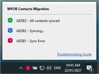 You can also click the icon to display the MYOB Contacts Migration window, which shows you a short description of what each icon means and a link to the Troubleshooting contacts.