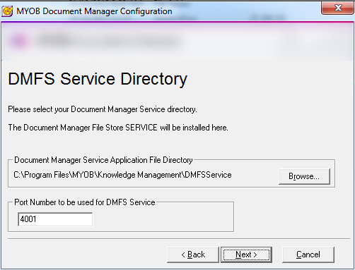 Click Next. The DMFS Service Directory window opens. By default, the DMFS Service is installed to the ProgramFiles folder with Port Number 4001. We recommend that you don't change these defaults.
