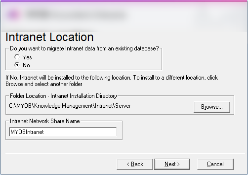 If you are not migrating Intranet data from an existing database, select the No option. MYOB Intranet will then be installed in the default Folder Location - Intranet Installation Directory that is displayed.