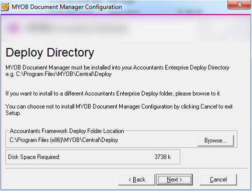 Deploy folder (also required for the server configuration) | C:\Program Files\MYOB\Central\Deploy | must be a local drive |