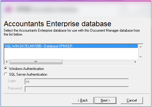 If you are repeating the server installation because you have more than one Accountants Framework database integrated with Document Manager, the Multi Database Option window opens. Select the Reconfigure a database only checkbox.