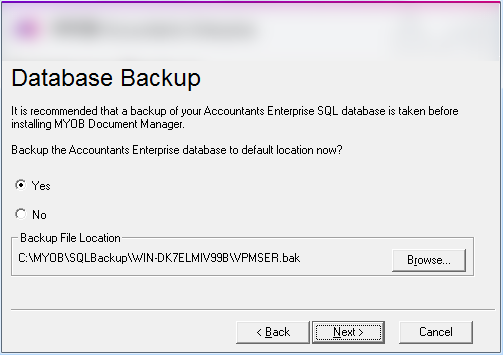 Click Yes to backup the database to the default location If you select No, you will need to confirm that you have back up copies already