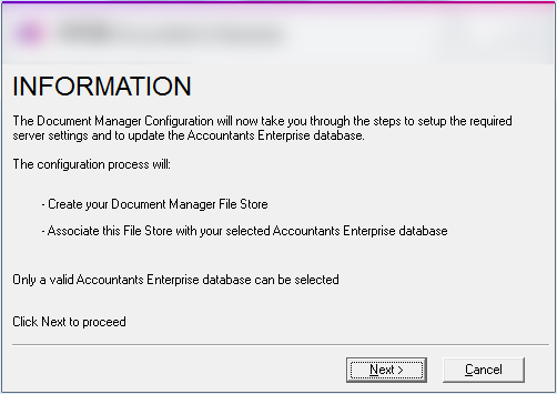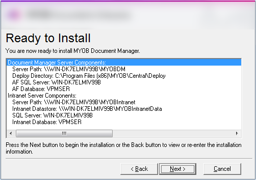 The Document Manager Configuration install sets up the Document Manager File Store location, the File Store service and the Indexing service. It must be run for all available MYOB AE databases.