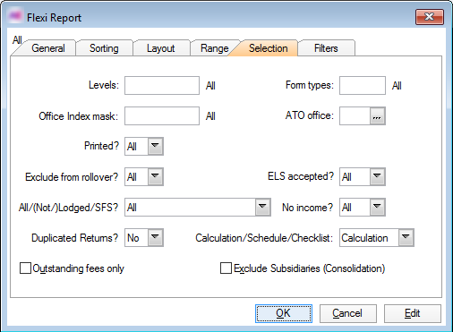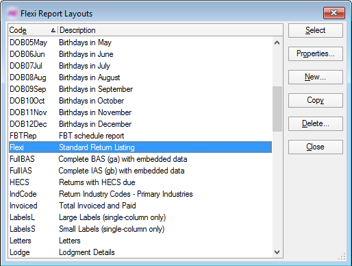If you have previously created your own flexi report layout for this report, select it. If not, select the AE Tax default report Flexi from the index.