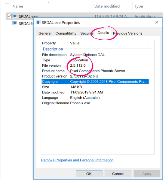 Right-click on C:\program files(x86)\MYOB\SRDAL\SRDAL.exe to view the Properties.