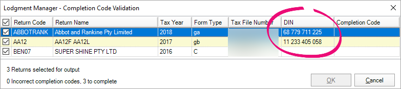 The DIN helps you identify the correct activity statement to use when lodging, if your practice uses the Completion code validation required option. This is useful if you lodge multiple activity statements at the same time for one client, as each activity statement has its own completion code.