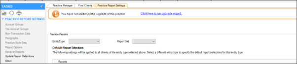 Go to Maintenance > Client Accounting > Practice Report Setting.