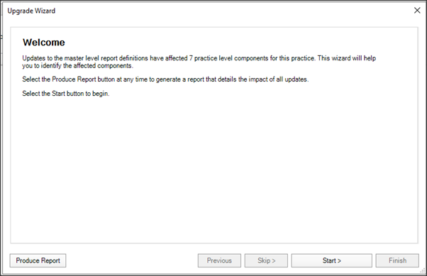 Select Click here to run upgrade wizard. The upgrade will identify the number of practice level components that will be affected by this upgrade.