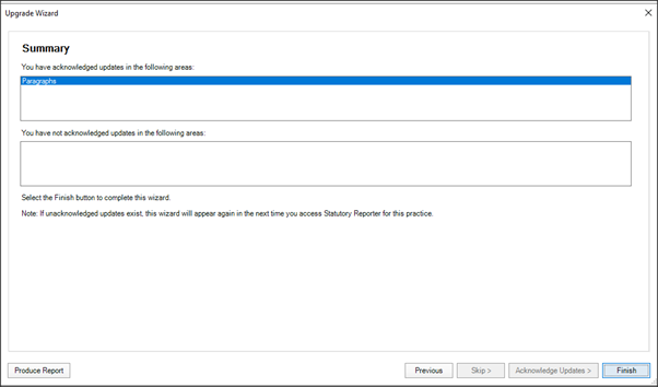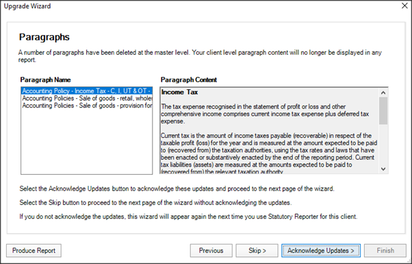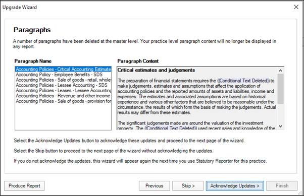 We’ve deleted a number of master level paragraphs. If you made any changes to the paragraphs at client level, then you'll see the upgrade wizard. This identifies any previously made changes to the deleted paragraphs.