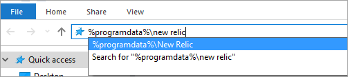 - On the Address bar, type %programdata%\new relic.
