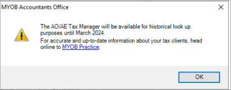 The AO/AE tax Manager will be available for historical lookup purposes until March 2024. For accurate and up-to-date information about your clients, head online to MYOB Practice.