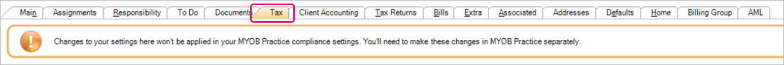 Any changes to your Tax settings in AE/AO (from the Tax tab) is not integrated with MYOB Practice compliance settings. You'll need to make any changes in MYOB Practice.