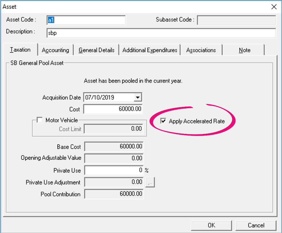 For the 2020 and 2021 financial years, if there are new assets in the Small Business Pool, you'll see an Apply Accelerated Rate checkbox when you create or edit the asset.