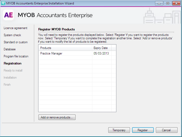 If you click Temporary, you can run AE Practice Manager as a single user until you contact MYOB Support to get your new registration code.
