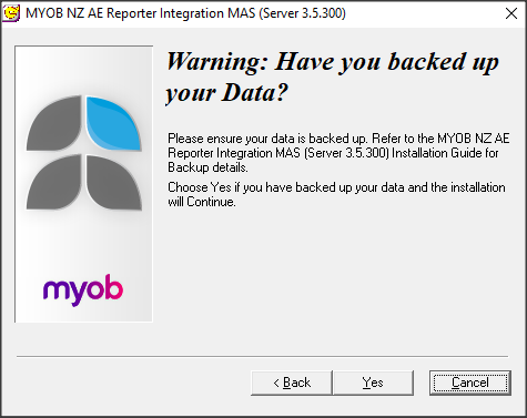 Review the licence agreement, clickYes to accept, and click Next. The backup reminder window appears.