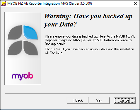 Review the licence agreement, click Yes to accept, and click Next. The backup reminder window appears.