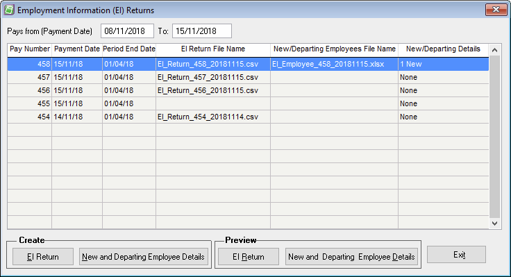 To preview return files for a pay, select the pay and click EI Return or New and Departing Employee Details under Preview. We'll generate and display a PDF report containing the information in each file.