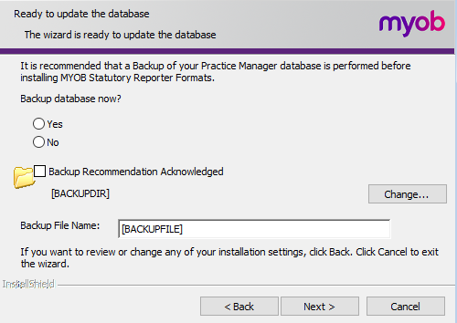 - Select Yes to back up the database now and select Backup Recommendation Acknowledged.