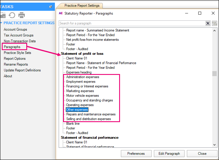 Rename an expense heading by selecting Paragraphs in practice settings or client settings.