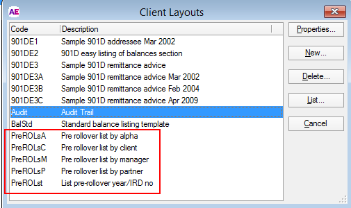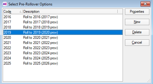 To check the pre-rollover settings, select Utilities > End of Year > Pre-Rollover > 2020 > Properties. You shouldn't need to change anything. Click OK.