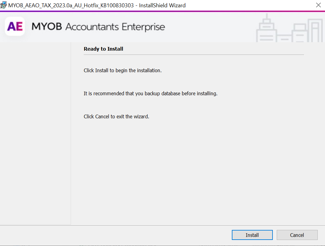 You must have MYOB AE/AO version 5.4.47 installed and the Tax version is 2023.0. To check your current version, click Help > About. If you don't have 2023.0 installed, you'll see the following message when installing the hotfix.