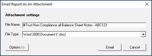 .The Email Report as an Attachment window opens. - In the Attachment Settings, enter a File Name or alternatively, keep the default name.
