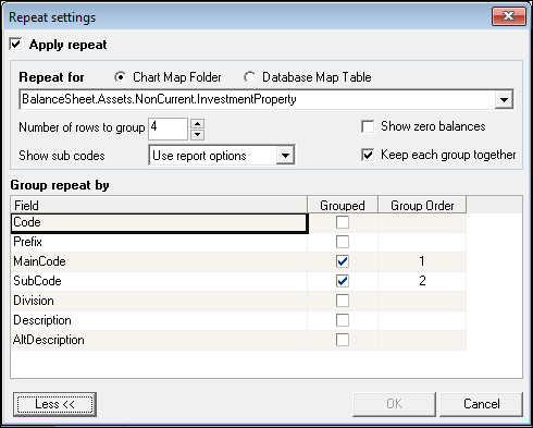 Group Order: allows multiple sort orders to be specified. For example, if the repeat needs to be grouped by MainCode, and then by SubCode, the Group Order value for the SubCode is 2 and the MainCode is 1).