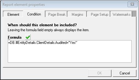 In the #Company Large report, the condition for the format Page Footer – Audited is =DB.#EntityDetails.ClientDetails.Audited="Yes".