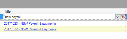 The documents tab allows the use of asterisks (*) wildcards to find any document with a title that includes the exact phrase. For example, when entering the term *NSW payroll* in the Title column, all documents with the exact phrase "NSW payroll" is returned.