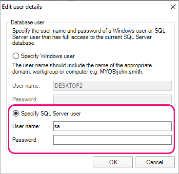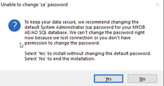 For best security practices and to keep your data secure, we recommend that you change the default password set by MYOB for sa username in SQL.