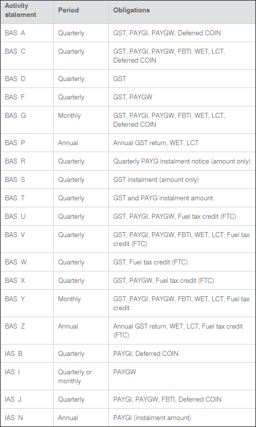 Use the ATO table below to determine what obligations is the client required to report. Look for the most common PLS form types to the corresponding Obligations. For example, if Form type Z is rejected, you could select Form type P.