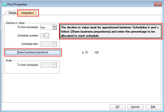 If the Share business proportions button becomes active, you are required to specify the percentage of the pooled depreciation that relates to each nominated business income schedule. This is done by clicking on the Share business proportions button. The at the SBE Integration of Pool deduction - Share window either click New to create a new entry or to edit an existing entry highlight the entry and click Properties. Ensure that a percentage is assigned and that the total percentage values assigned across all business income schedules doesn't exceed 100%.