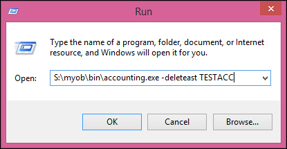 In the Open field, type X:\MYOB\bin\accounting.exe -deleteast <client code> and click OK. Where X:MYOB\bin is the installation path of the program directory and <client code> is the client code of the contact you are deleting the asset register for.