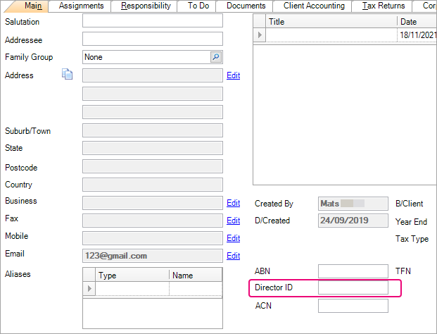 In AE/AO, you can find the Director ID field in the Main tab, and also in the Extra tab in the client details. This field will be available for all contacts, but you need to complete the Director ID field only for individuals and not companies.