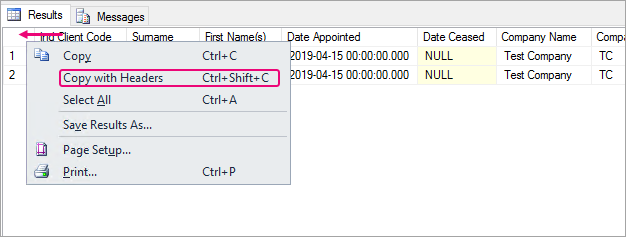 In the Results tab, right-click the top left box and select Copy with Headers.