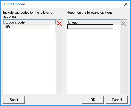 Repeat step 3 for all account numbers you wish to show sub codes for, then click OK. The description Sub Code appears in the Report Options field.
