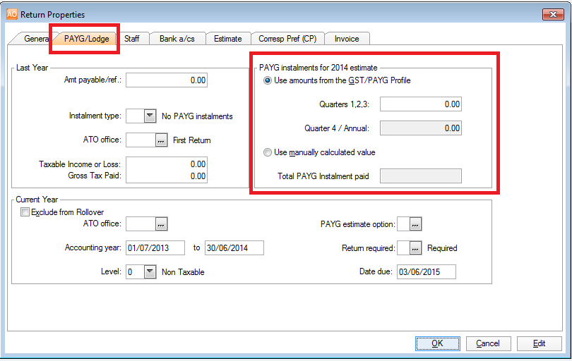 If you have only prepared the fourth Quarterly Activity Statement, enter the total PAYG Instalment paid for Quarters 1 to 3 and the value for Quarter 4 will integrate directly from the GST/PAYG Profile area into the Properties > PAYG/Lodge tab. If you want to check the values in the GST/PAYG Profile area refer to the section AccessingtheGST/PAYGProfile.