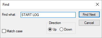 - In the Find what field, type START LOG and select Up.