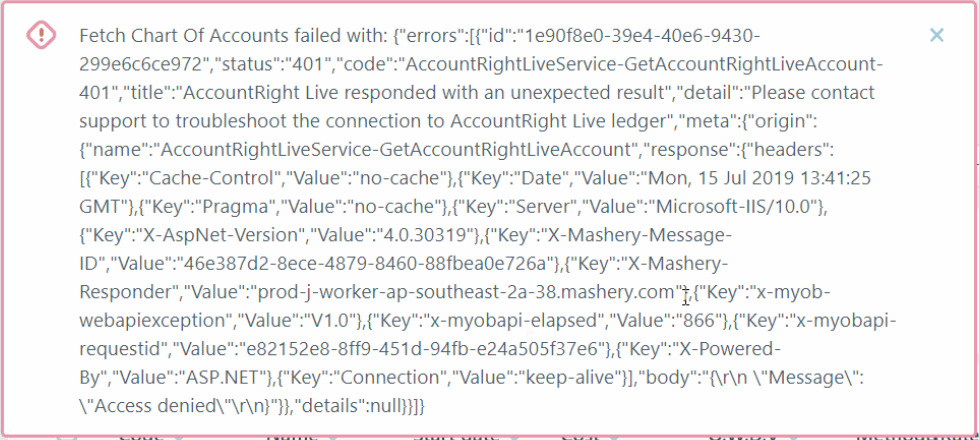 Fetch Chart Of Accounts failed with: {"errors":[{"status":"401","code":"AccountRightLiveService-GetAccountRightLiveAccount-401","title":"AccountRight Live responded with an unexpected result","...}}]}
