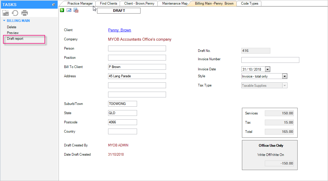On the TASKS bar, click Draftreport within the Draft Bill.
