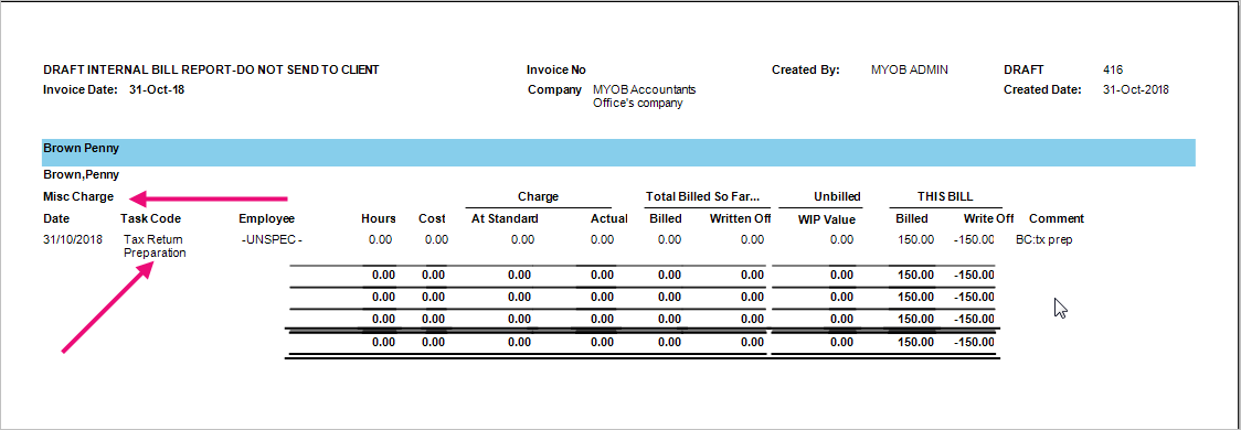 Review the report and make a note of the Task Codes that have an amount in the This Bill column.