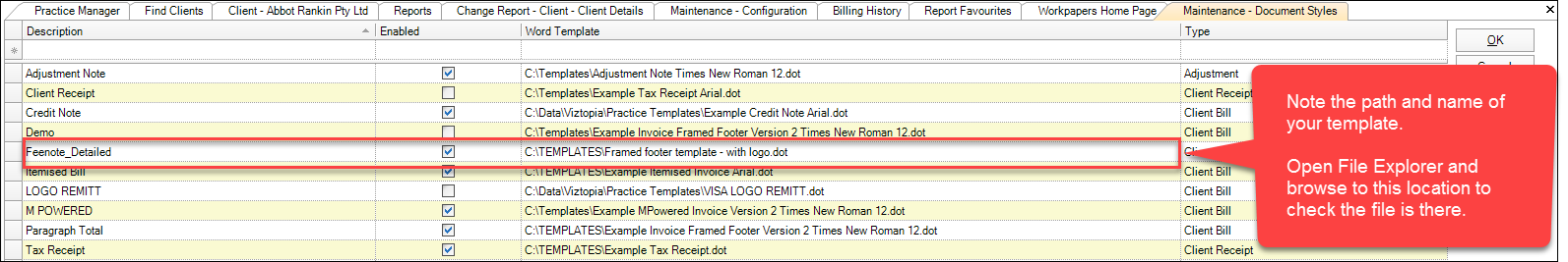 For the Document Style used for the bill, note the location and name of the Word Template by checking the value in the Word Template column.