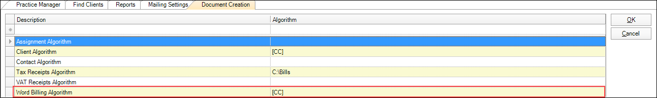 Where the Algorithm shows S:\Bills\[CC], this means this setting will override what is recorded in the Billing Startup Path and use the location listed in the Word Billing Algorithm, so the bill will be stored in a subfolder (based on the Client Code) in the Word Billing Algorithm location.