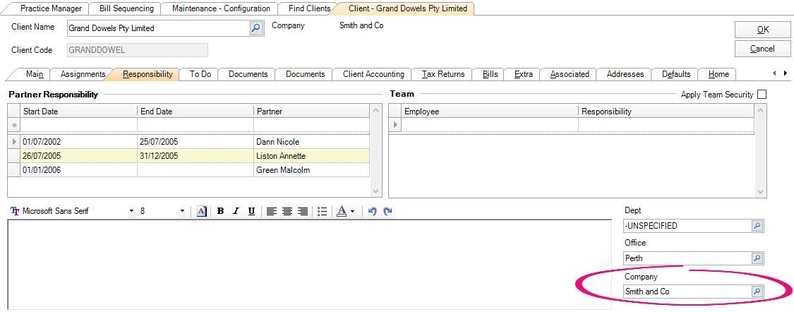 Select the company that corresponds to a valid company that appeared in the Bill Sequencing screen and also is the Company that has issued the bill and click OK. The Responsibility tab appears with the company name displayed.