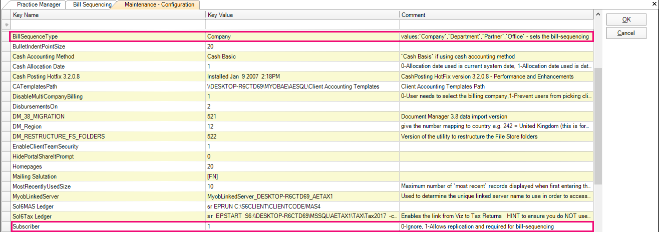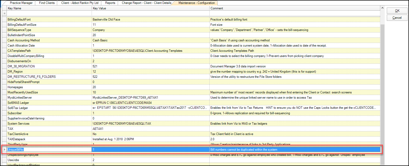 Change the KeyValue for the KeyName UniqueBillNo from 1 to 0 and click OK.