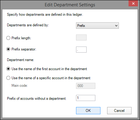 Enter the prefix number in the Prefix of accounts without a department field if there are income or expense accounts that do not belong to a department. In this example, the prefix will be 1.