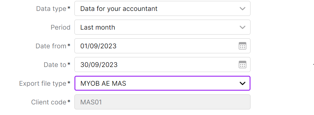 In MYOB Business, under Business Settings make sure that the MAS client code is entered. For example, MAS01.